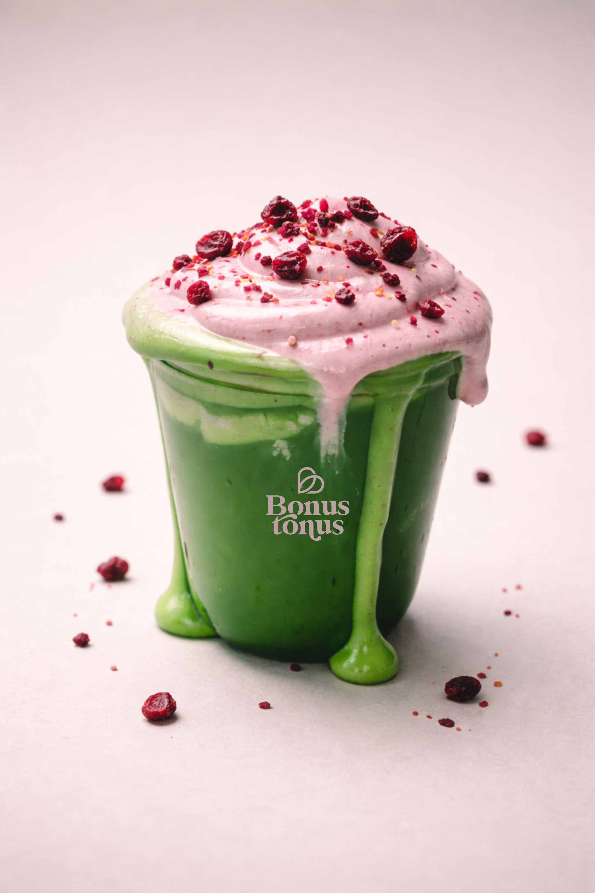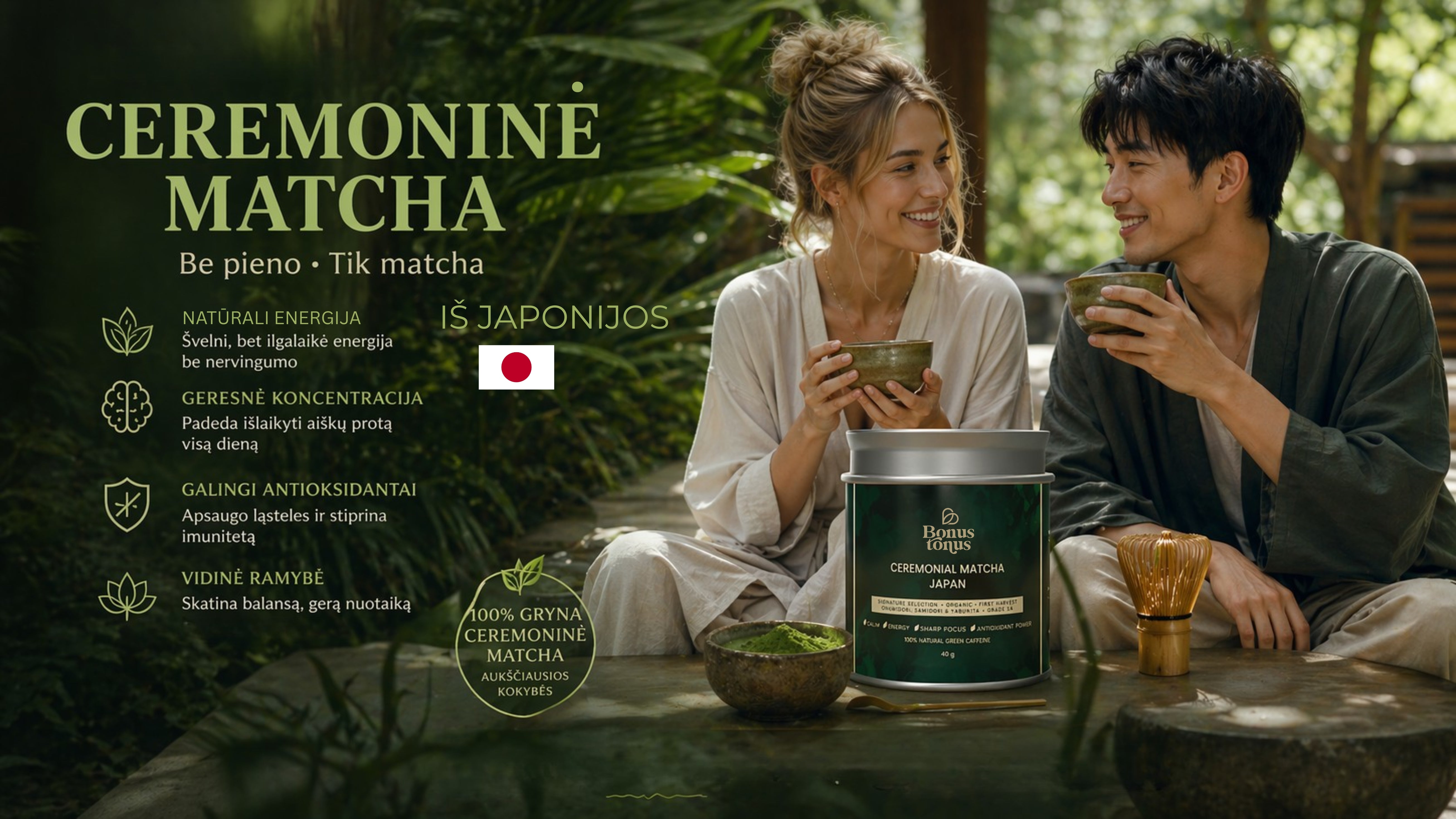 Gera žinia – tau nereikia turėti japoniškos bambukinės šluotelės (chasen), kad pasigamintum skanią matchą namuose. Viskas, ko reikia – paprastas pieno plakiklis ar net blenderis. Žinoma, jei turi japonišką šluotelę – dar geriau! Su ja pajusi visą paruošimo ritualą. Visi būdai puikūs – svarbiausia, kad matcha būtų kokybiška 💚 Visų pirma, įberk pusę arbatinio šaukštelio (1-2g) BONUS TONUS matchos į dubenėlį. Įpilk šięk tiek (60-70ml) šilto, šalto ar karšto (70-80 °C) bet tik ne verdančio vandens. Verdantis vanduo ne tik sugadina skonį bet ir sunaikina vitaminus bei antioksidantus. Plak ~10–15 sekundžių, kol pasidarys vientisa puta. Japonai įšplaktą matchą sumaišo su šiltu vandeniu ir geria iš karto, tačiau jeigu tau norisi saldžiau į tuščią puodėlį įpilk norimo skonio sirupo, uogienės ir pieno. Išmaišyk, supilk ledukus ir išplaktą matchą. Vuolia! 💚